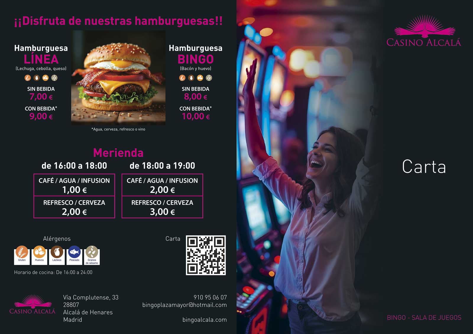 ¡Las mejores hamburguesas te esperan en Bingo Alcalá! Deléitate con cada bocado mientras disfrutas de tu juego favorito. Ven a probar nuestras jugosas hamburguesas, hechas al momento y con ingredientes frescos, ¡porque aquí jugar y comer es ganar!